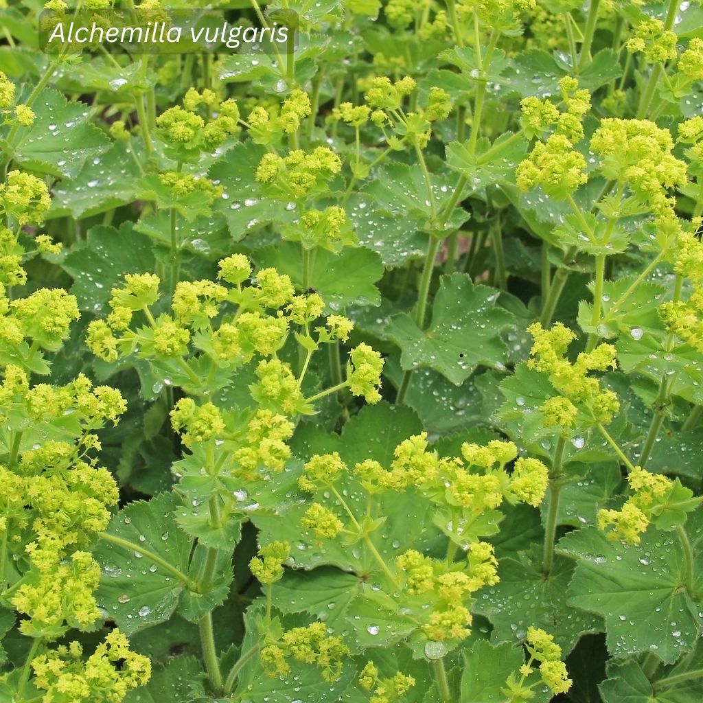 Lady's Mantle is a perennial plant growing 10-50 cm tall with distinctive fan-shaped, pleated leaves that collect dewdrops, and clusters of small yellow-green flowers.