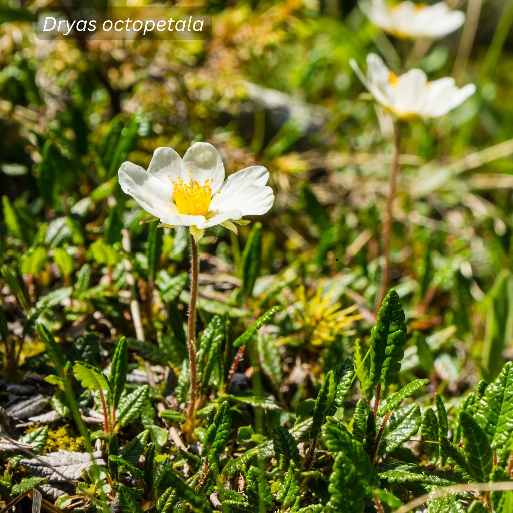 Mountain Avens is a dwarf evergreen shrub growing 5-10 cm tall with small, leathery, scalloped leaves and large white eight-petaled flowers. After flowering, produces distinctive feathery seed heads.