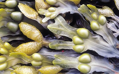 Bladderwrack is a brown seaweed with flat, dichotomously branched fronds 15-100 cm long. It has a central midrib and paired air bladders that help it float. The fronds are olive to dark brown with swollen reproductive tips.