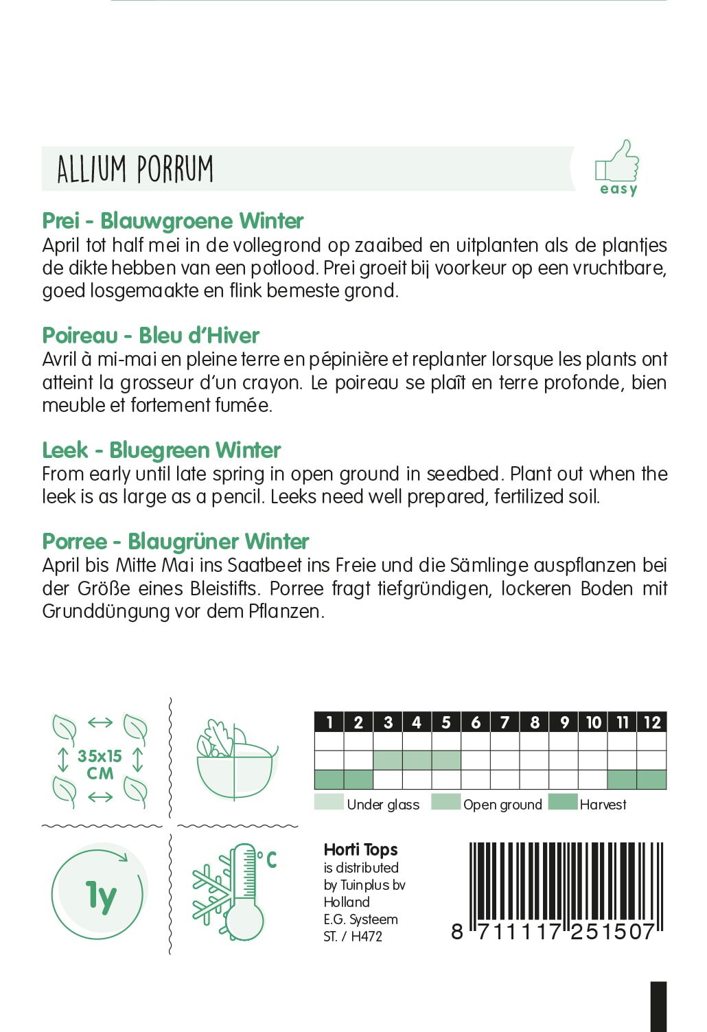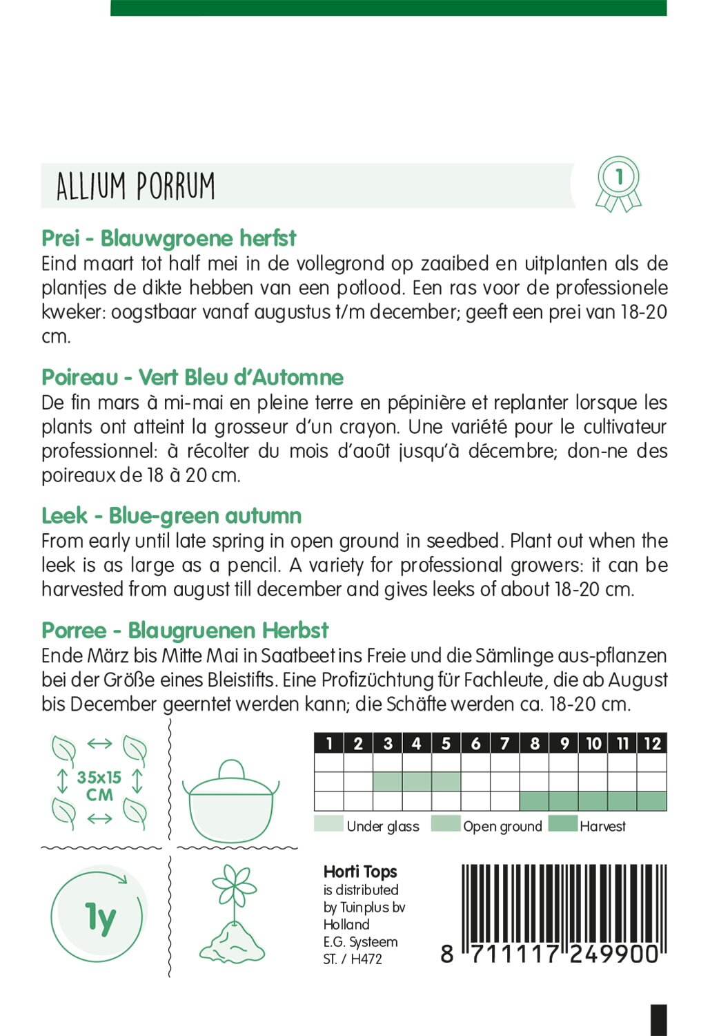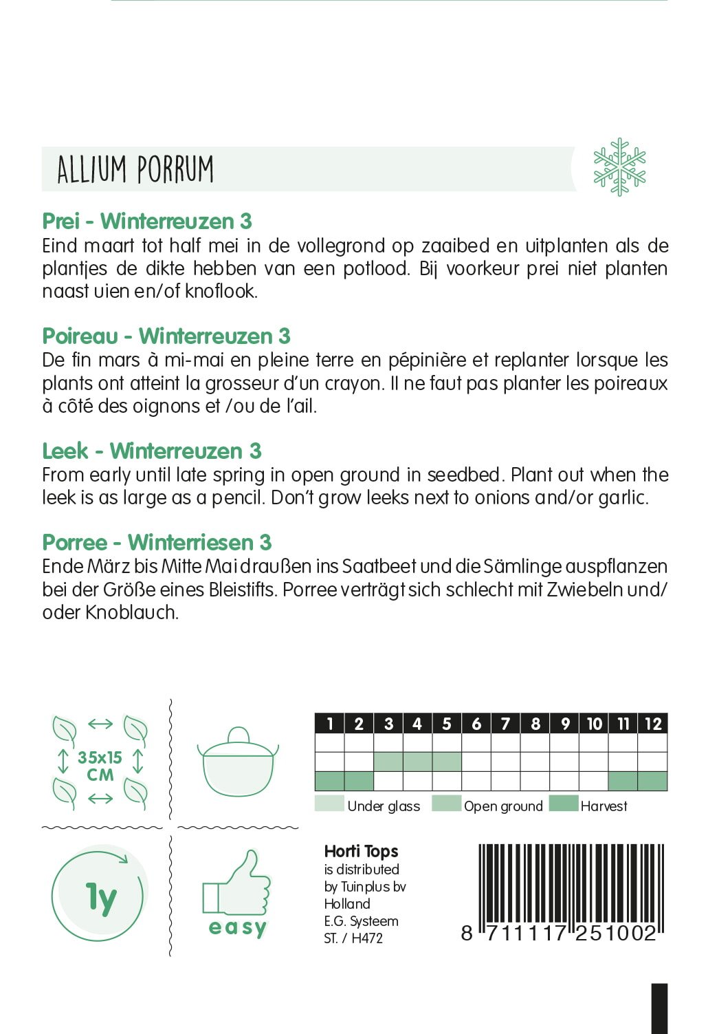 Weight: ca. 2.5 gram | Botanical: Allium porrum | Type: Open-pollinated | Origin: Netherlands