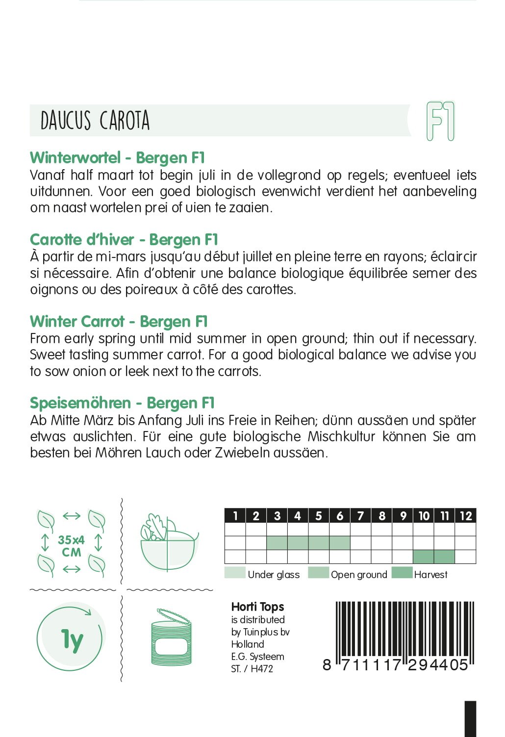 Carrot Bergen F1 (Daucus carota) is a nutritious vegetable for your garden. Sow outdoors from March to June.