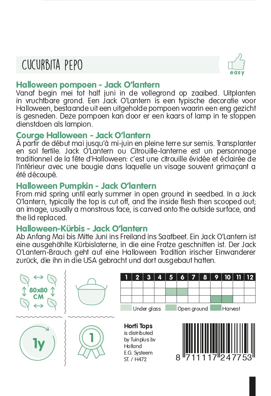 Pumpkin Jack ‘O Lantern (Cucurb. Pepo) (Cucurbita pepo) is a nutritious vegetable for your garden. Sow outdoors from May to June.