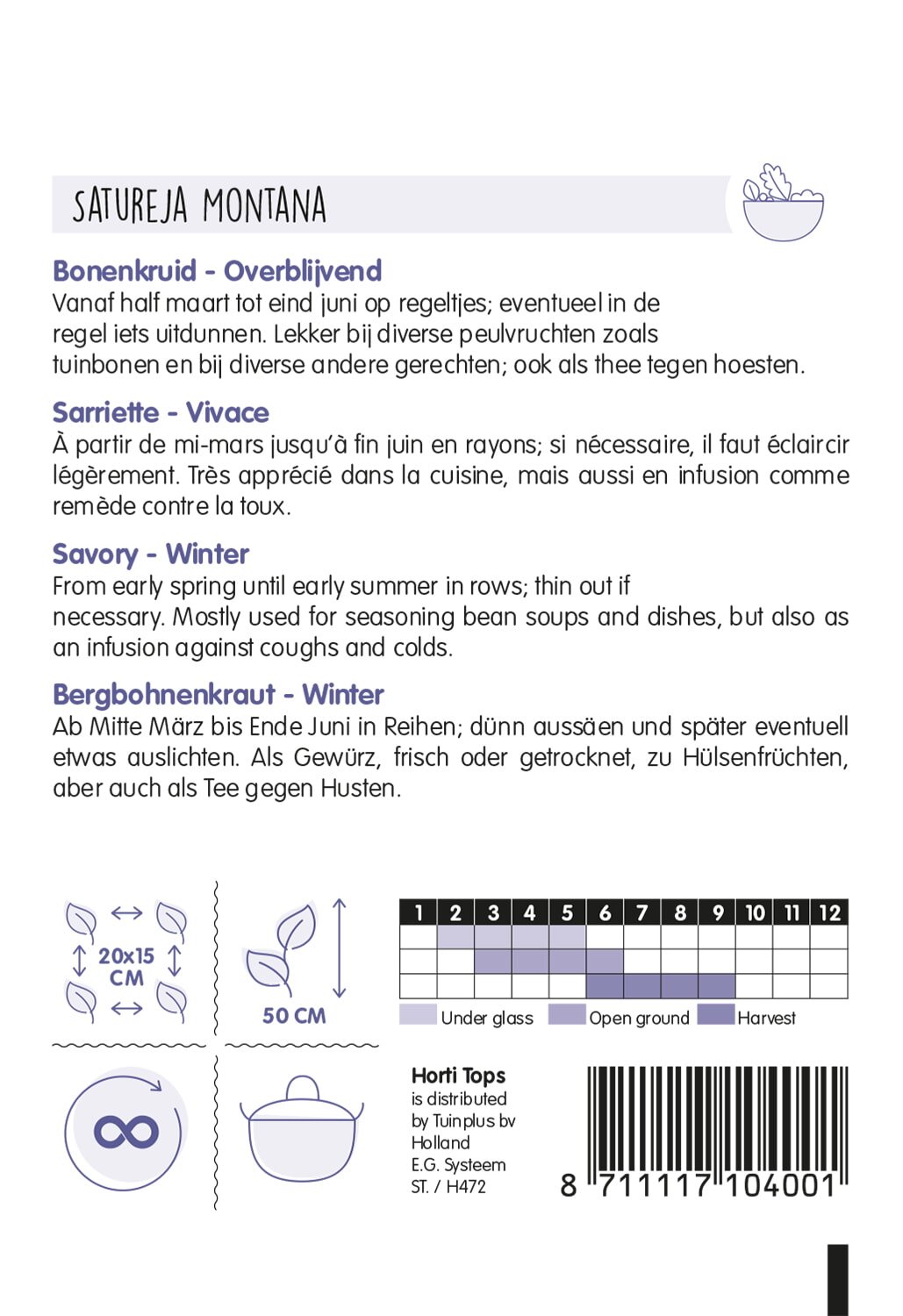 Så tidlig på våren i forplantningsanlegg eller fra sen vår til forsommer utendørs i såbed. Tynn ut og transplanter deretter. Bladene kan brukes ferske eller tørkede til salater, sylteagurk, eddik og supper. Den kan også brukes til kylling- og fiskeretter.