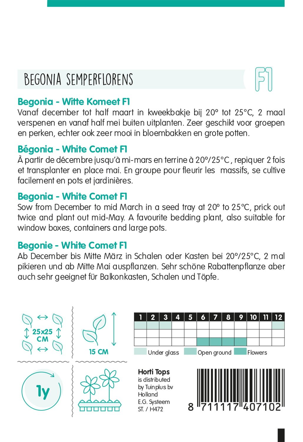 Begonia Semp. F1 Hybrid White Comet (Begonia semperflorens) is a beautiful flowering plant. Sow indoors from December to March. Expected height: 15 cm.