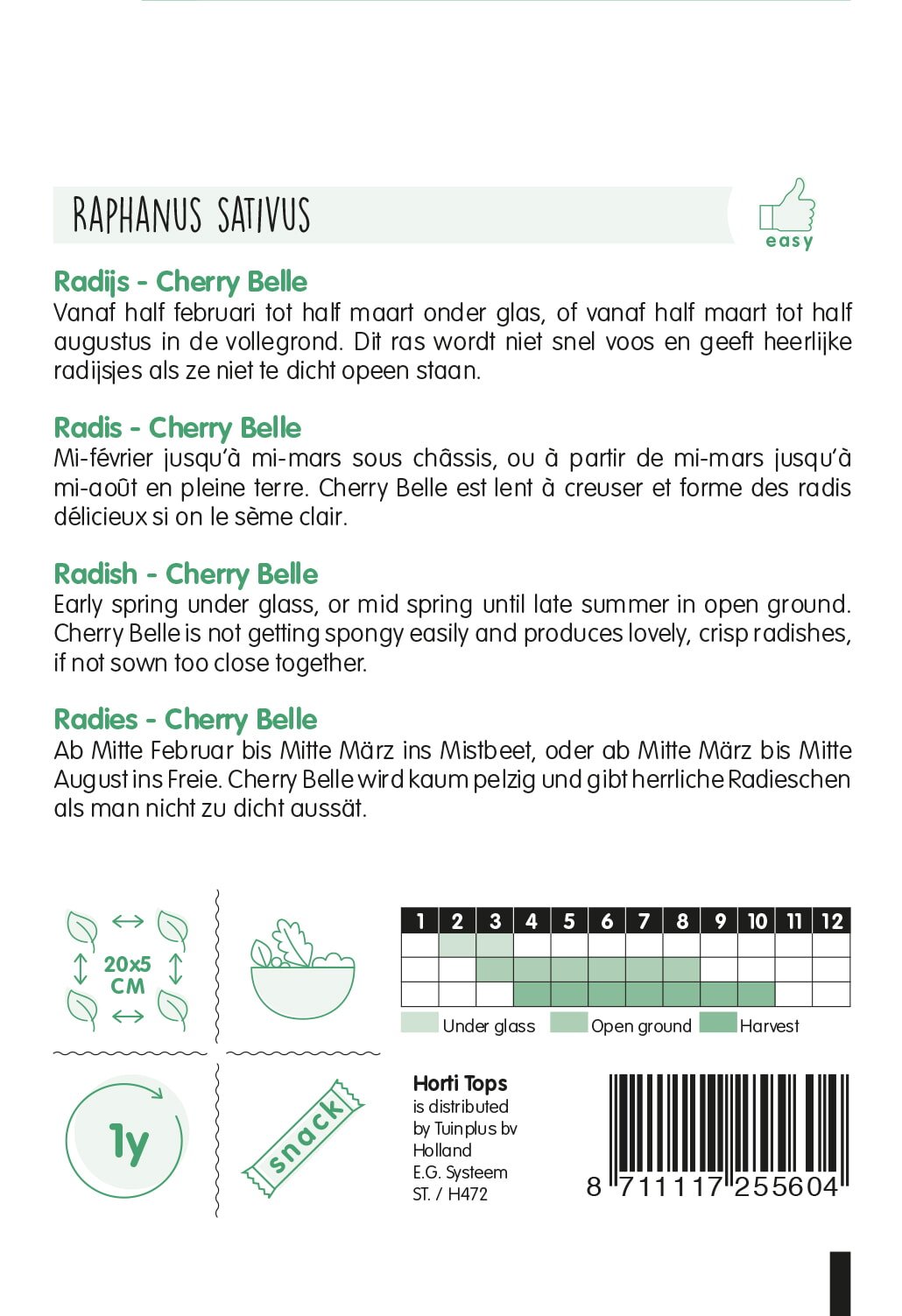 Radish Cherry Belle (Raphanus sativus) is a nutritious vegetable for your garden. Sow indoors from February to March, or outdoors from March to August.